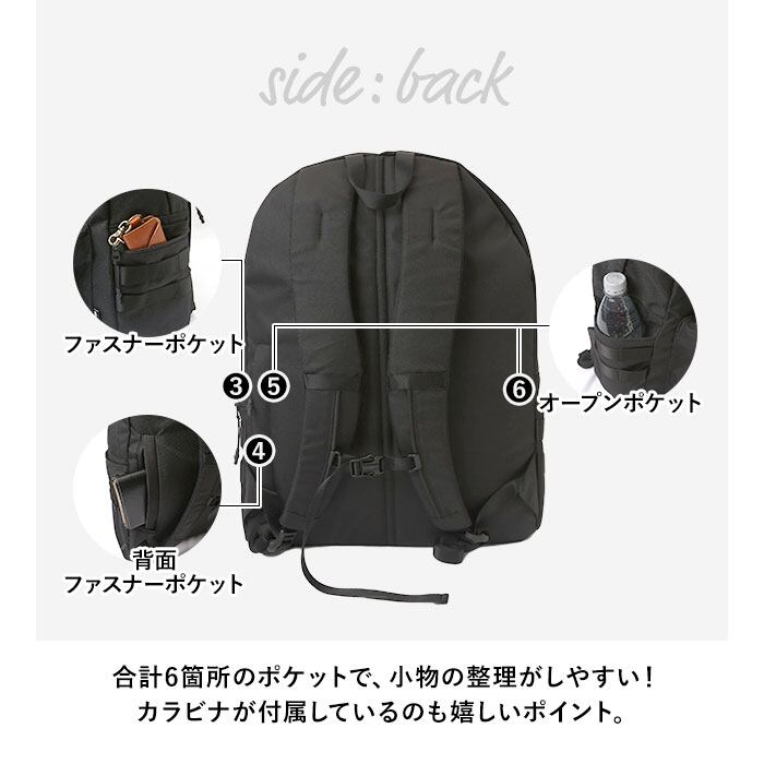 ・リュック前面や背面に、スマホなど日常使いのアイテムがサッと取り出せる、便利なファスナーポケットを配置。
