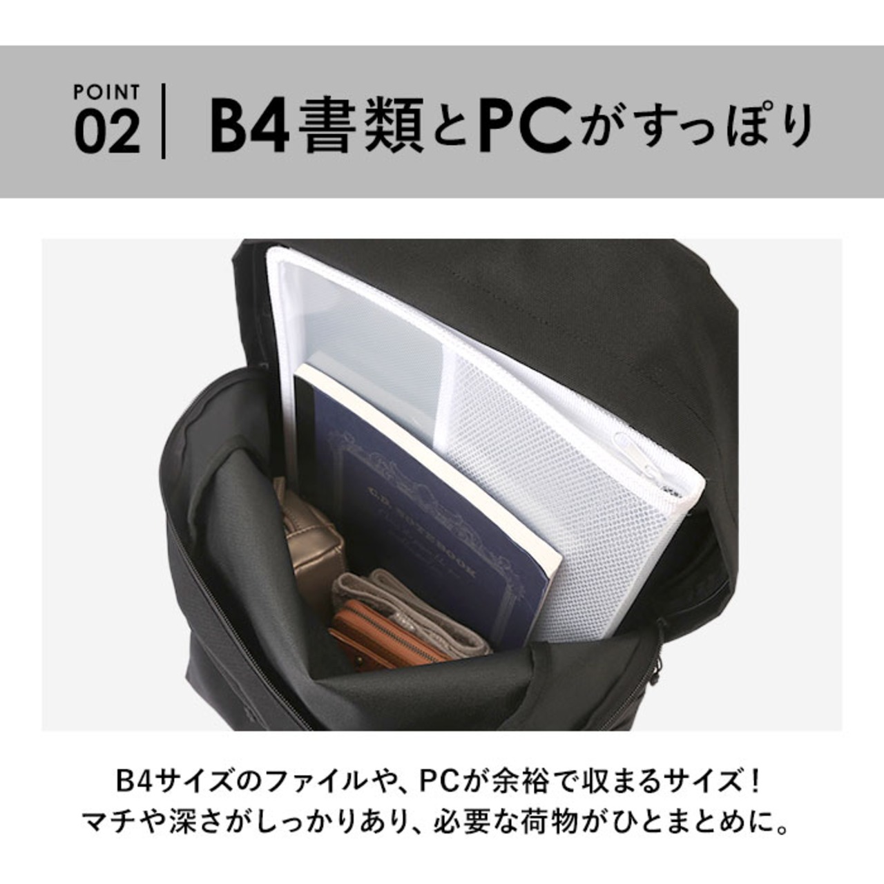 ・B4サイズのファイルが余裕で収まる!マチや深さがしっかりあり、通勤通学に必要な荷物がひとまとめ◎取り外し可能なカラビナが付属。