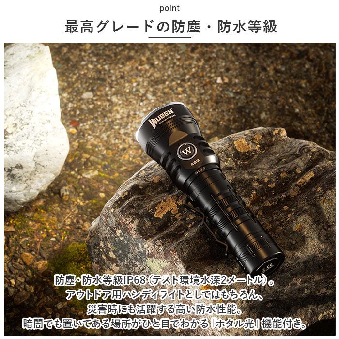 ・防塵・防水等級IP68(テスト環境水深2メートル)。アウトドア用ハンディライトとしてはもちろん、災害時にも活躍する高い防水性能。