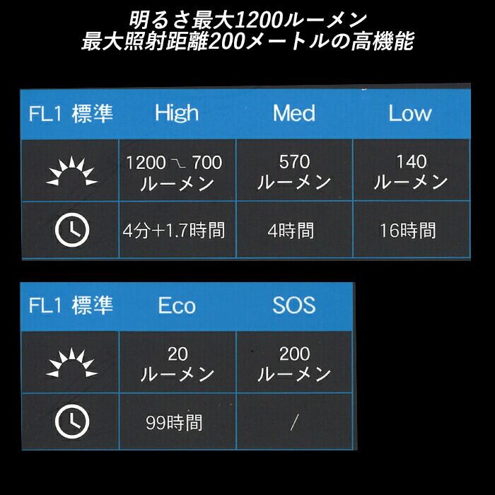 ・明るさ最大1200ルーメン、最大照射距離200メートルの高機能。