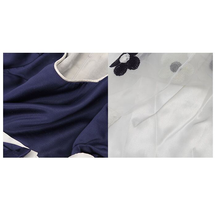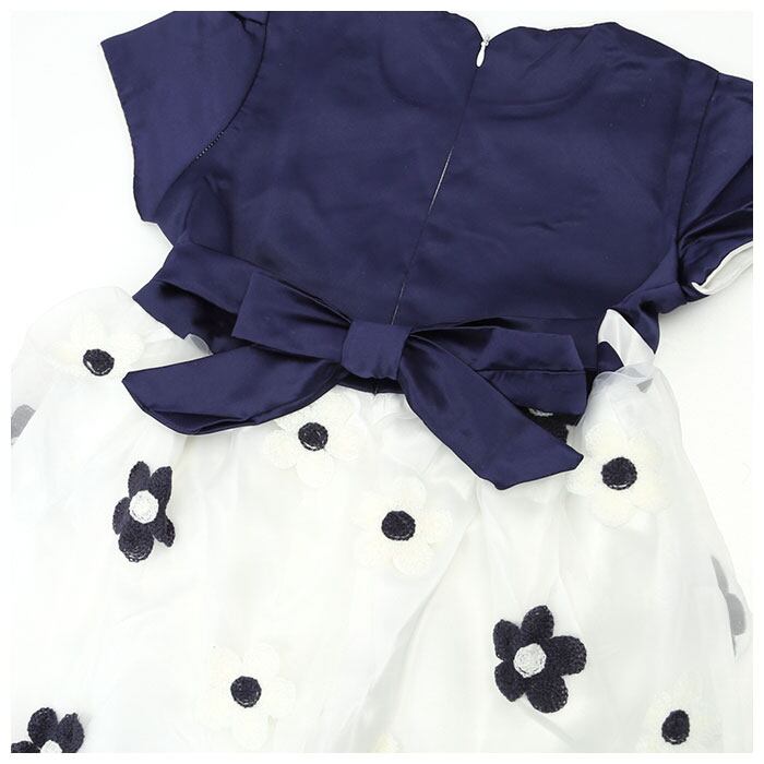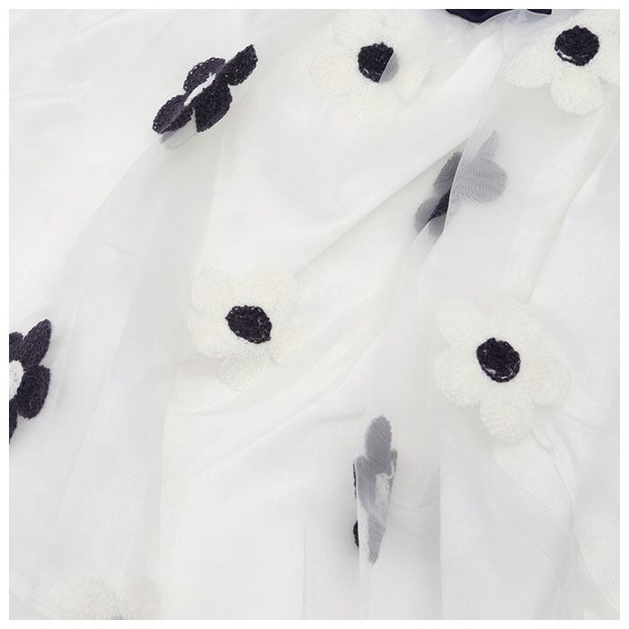 ・スカート部分はチュールを重ねた、ふんわりシルエット。全体に散りばめられたお花の刺繍もオシャレ♪