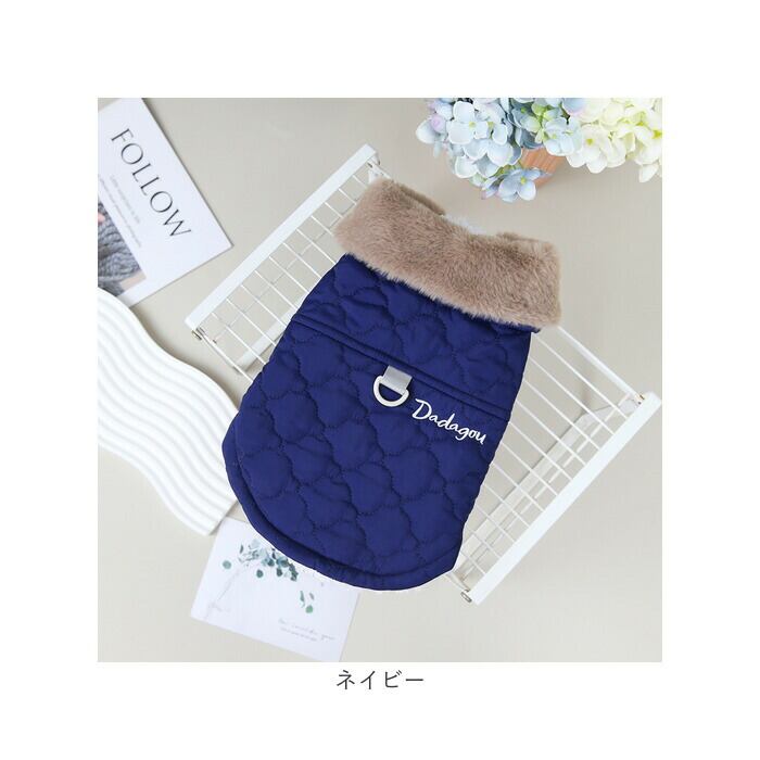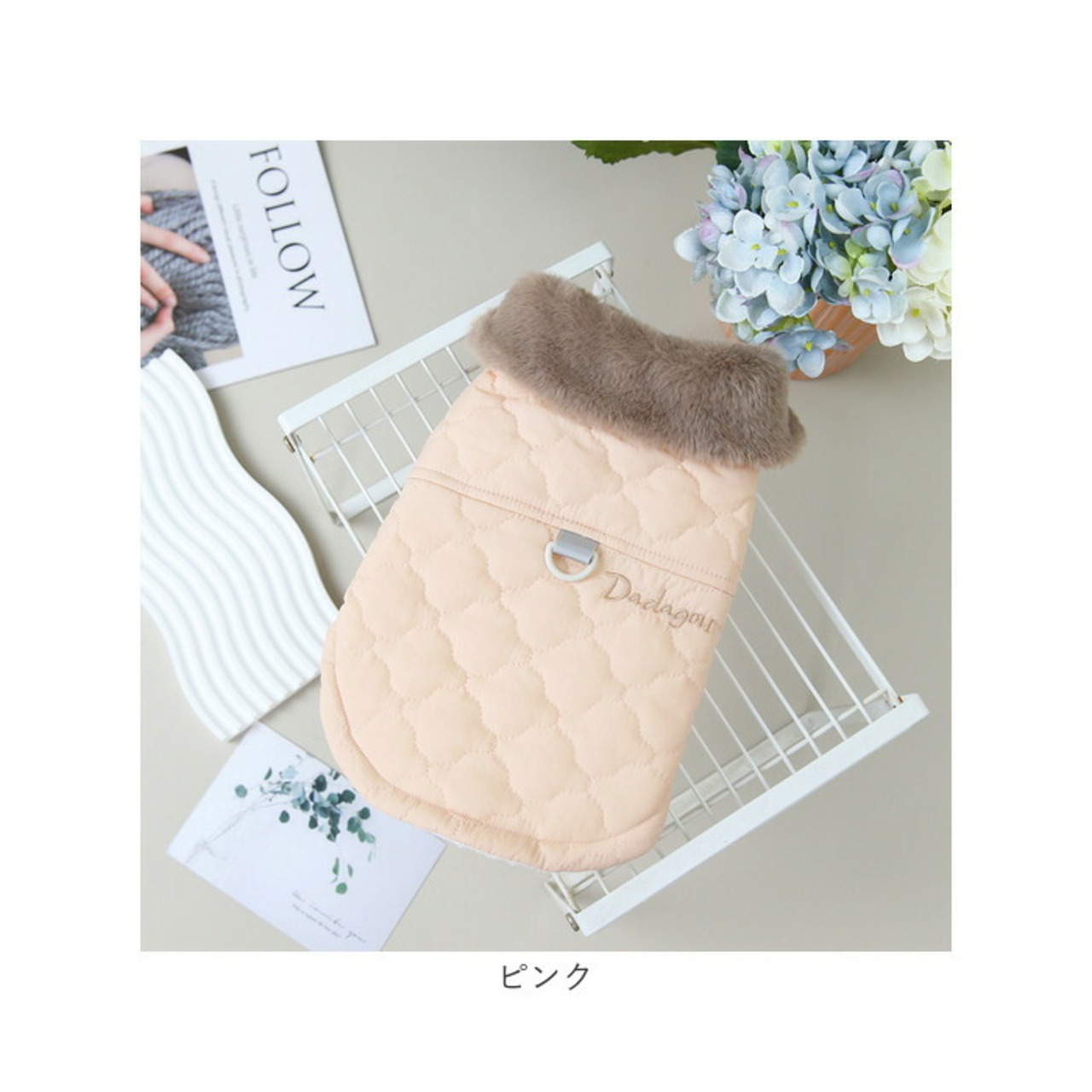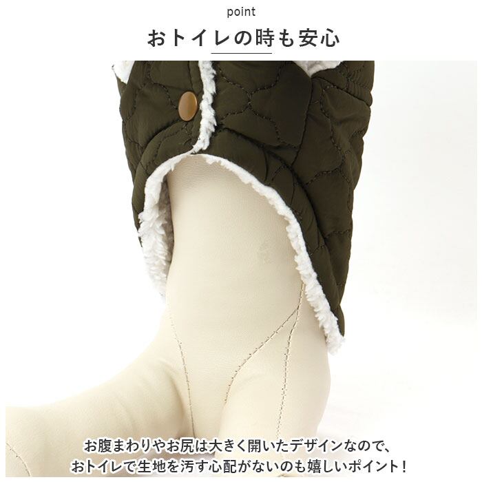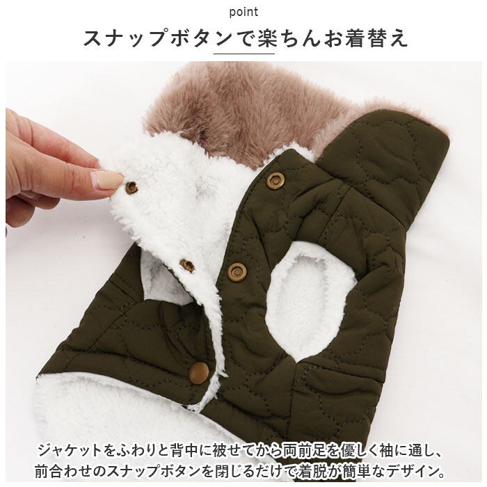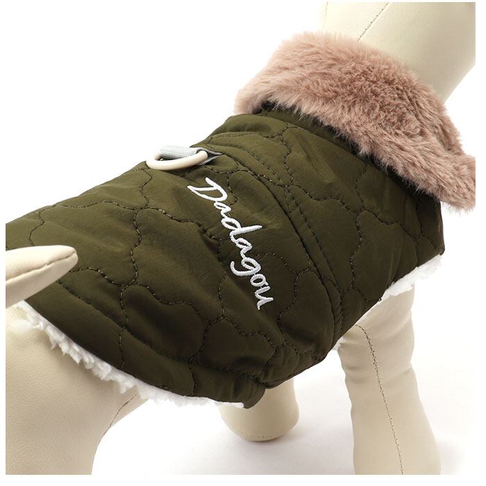 ・アースカラーのキルティング生地にココアブラウンのファーが飼い主さんの秋冬ファッションに素敵にシンクロ。冬の散歩道に映えるオシャレなカラーラインナップ。