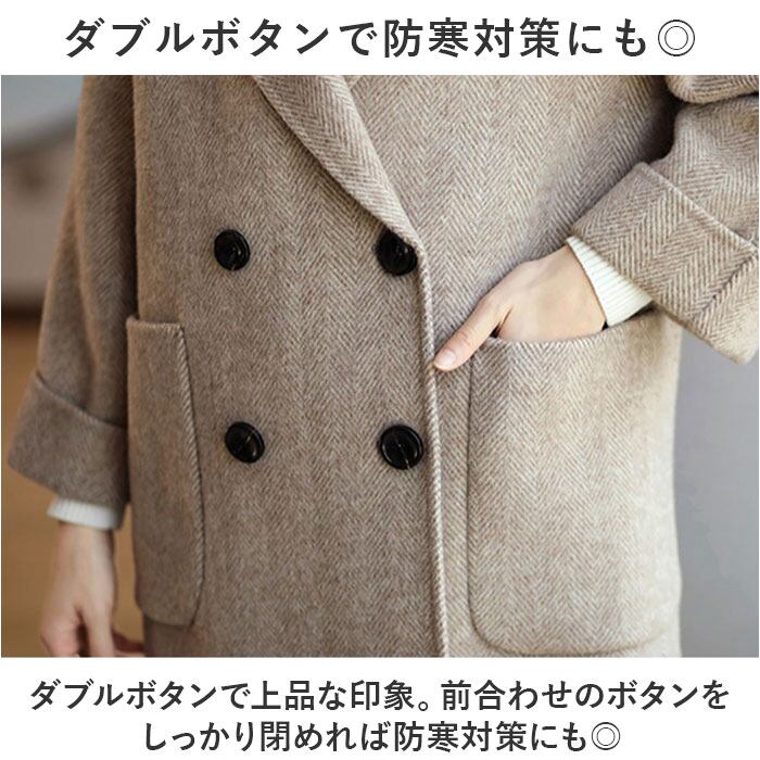 ・ダブルボタンで上品な印象。前合わせのボタンをしっかり閉めれば防寒対策にも◎