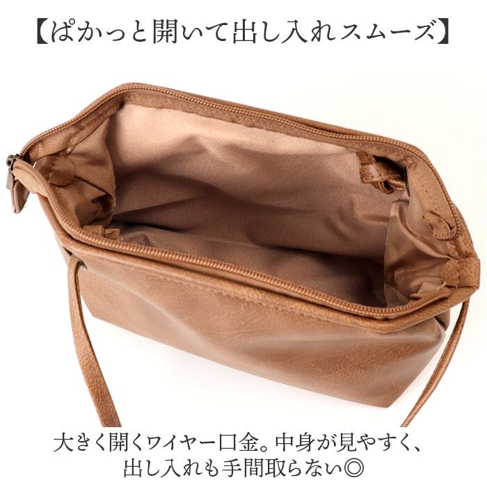 ・本革風のシボ感がある合皮素材を使い、落ち着きのある印象に仕上げたミニショルダー。