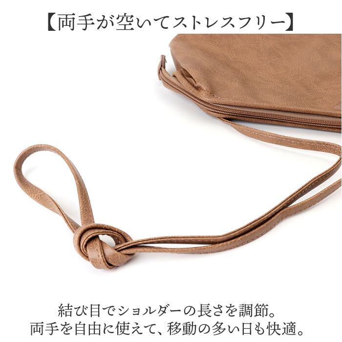 ・結び目でショルダーの長さを調節。両手を自由に使えて、移動の多い日も快適。