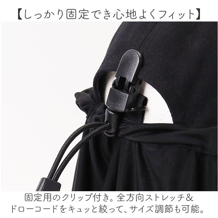 ・固定用のクリップ付き。全方向ストレッチ&ドローコードをキュッと絞って、サイズ調節も可能。