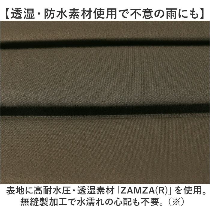 ・表地に高耐水圧・透湿素材「ZAMZA(R)」を使用。無縫製加工で水濡れの心配も不要。