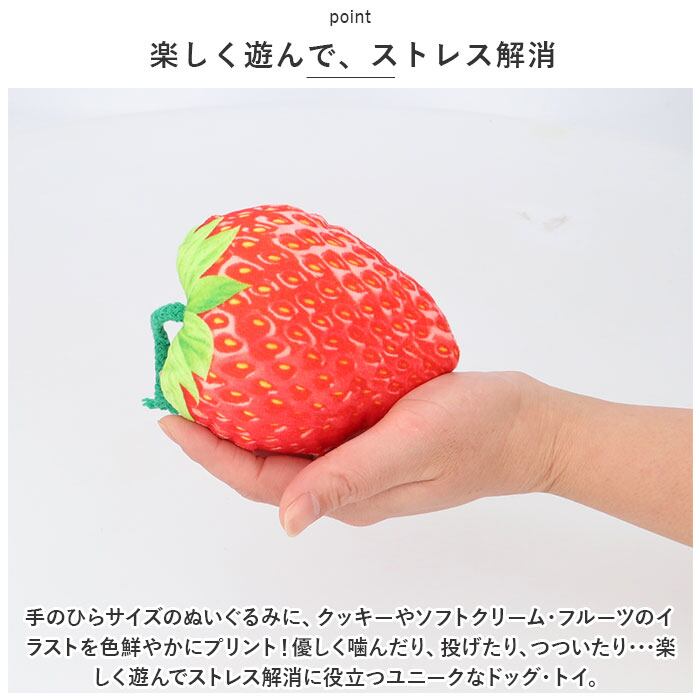 ・手のひらサイズのぬいぐるみに、クッキーやソフトクリーム・フルーツのイラストを色鮮やかにプリント!優しく噛んだり、投げたり、つついたり・・・楽しく遊んでストレス解消に役立つユニークなドッグ・トイ。