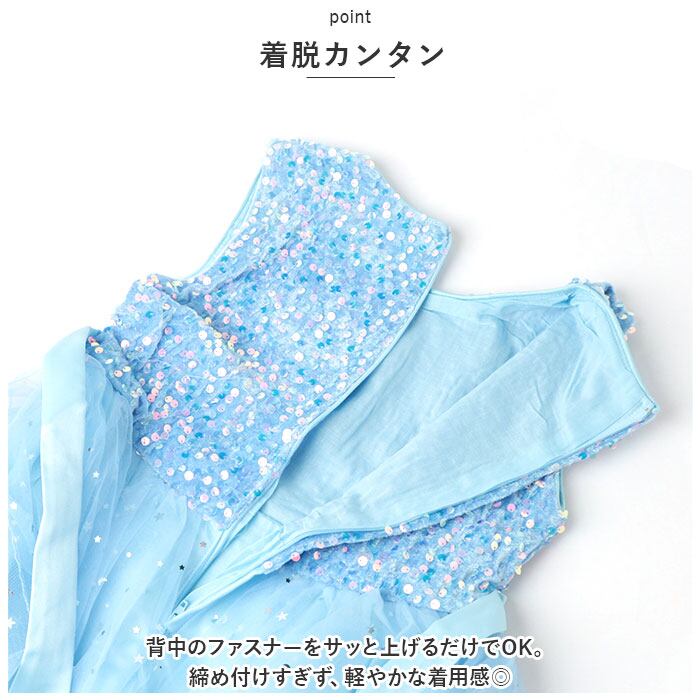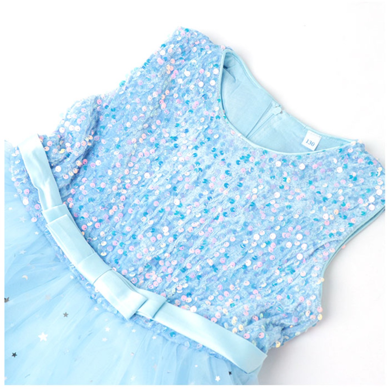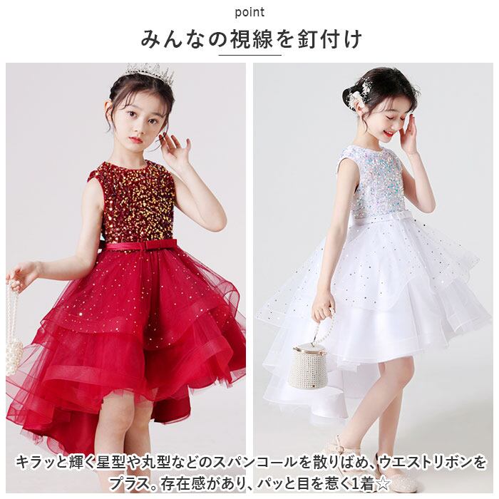 ・キラッと輝く星型や丸型などのスパンコールを散りばめ、ウエストリボンをプラス。存在感があり、パッと目を惹く1着☆