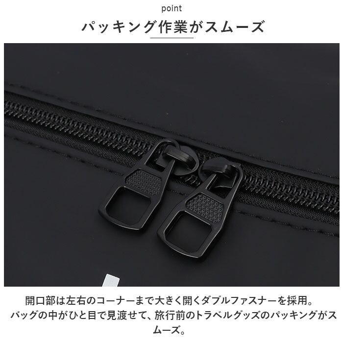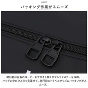 ・開口部は左右のコーナーまで大きく開くダブルファスナーを採用。バッグの中がひと目で見渡せて、旅行前のトラベルグッズのパッキングがスムーズ。