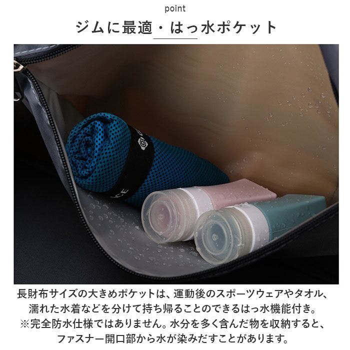 ・長財布サイズの大きめポケットは、運動後のスポーツウェアやタオル、濡れた水着などを分けて持ち帰ることのできるはっ水機能付き。(※完全防水仕様ではありません。水分を多く含んだ物を収納すると、ファスナー開口部から水が染みだすことがあります。)