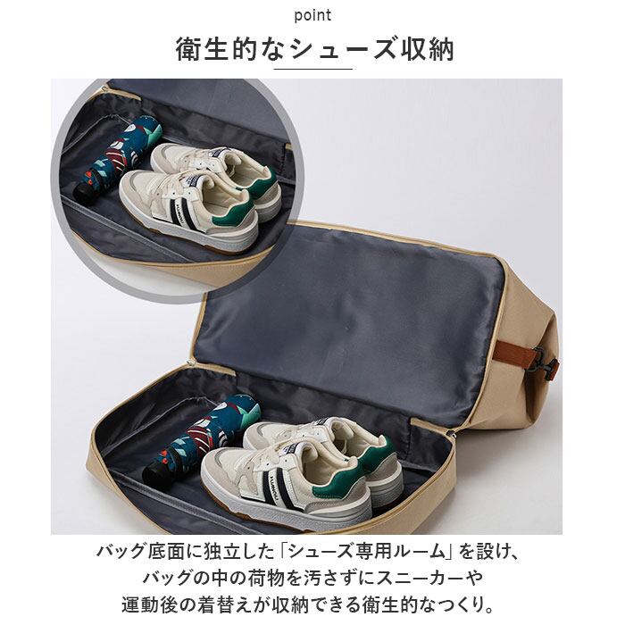 ・バッグ底面に独立した「シューズ専用ルーム」を設け、バッグの中の荷物を汚さずにスニーカーや運動後の着替えが収納できる衛生的なつくり。