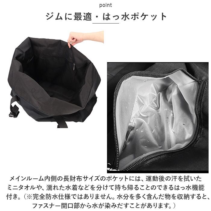 ・メインルーム内側の長財布サイズのポケットには、運動後の汗を拭いたミニタオルや、濡れた水着などを分けて持ち帰ることのできるはっ水機能付き。(※完全防水仕様ではありません。水分を多く含んだ物を収納すると、ファスナー開口部から水が染みだすことがあります。)