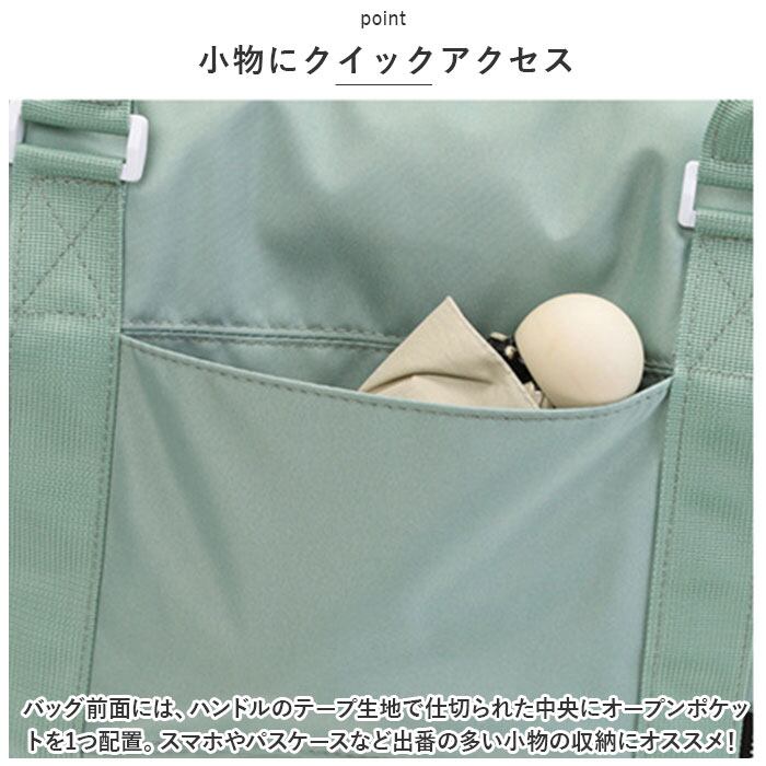 ・バッグ前面には、ハンドルのテープ生地で仕切られた中央にオープンポケットを1つ配置。スマホやパスケースなど出番の多い小物の収納にオススメ!