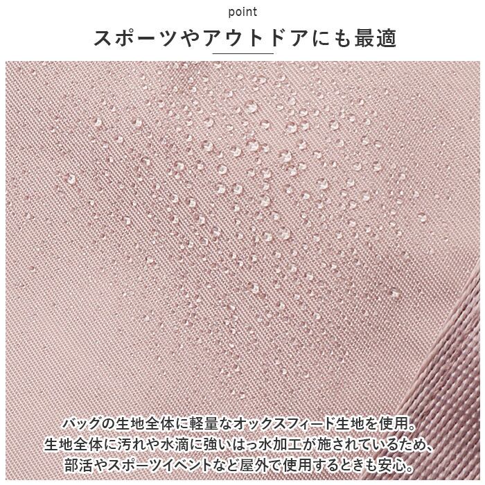 ・バッグの生地全体に軽量なオックスフォード生地を使用。生地全体に汚れや水滴に強いはっ水加工が施されているため、部活やスポーツイベントなど屋外で使用するときも安心。