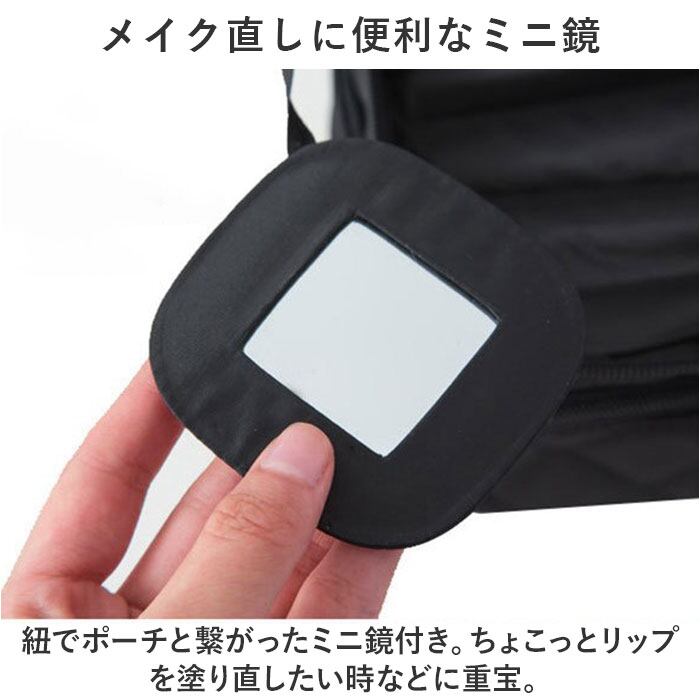 ・紐でポーチと繋がったミニ鏡付き。ちょこっとリップを塗り直したい時などに重宝。