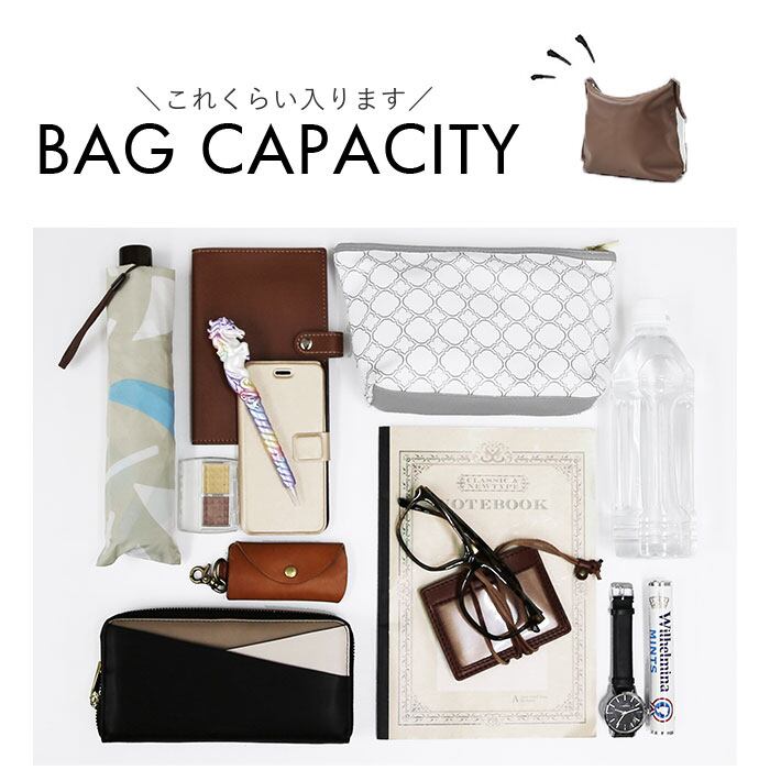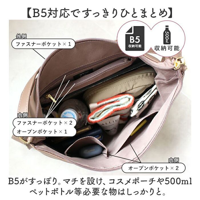 ・B5がすっぽり。マチを設け、コスメポーチや500mlペットボトル等必要な物はしっかりと。