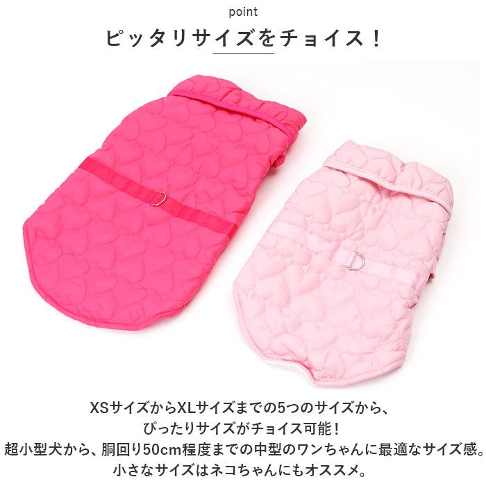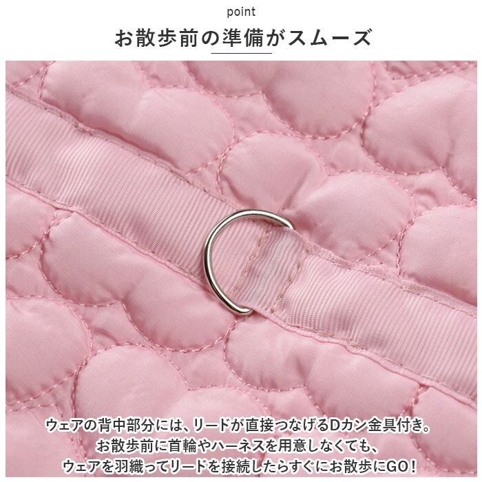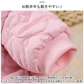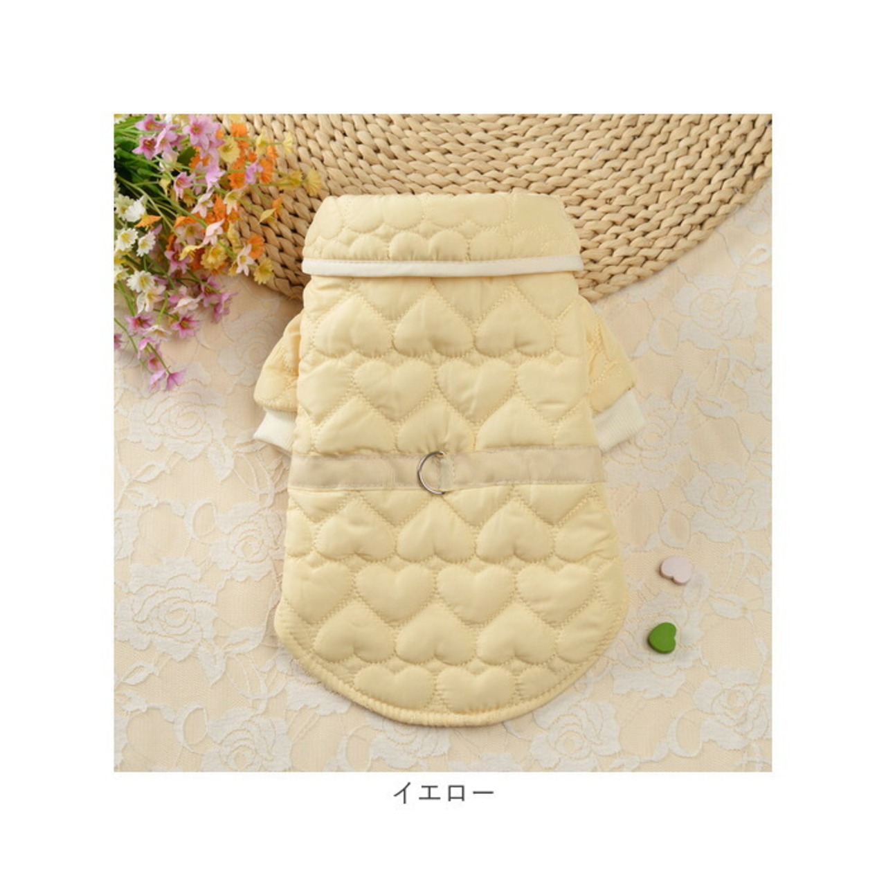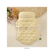 ・表生地は、ぷっくりハート型のステッチを施したふかふかのキルティング素材。内側はサラリと肌触りのよいガーゼ生地で仕上げた、軽くて保温性抜群のペット用ジャケット。