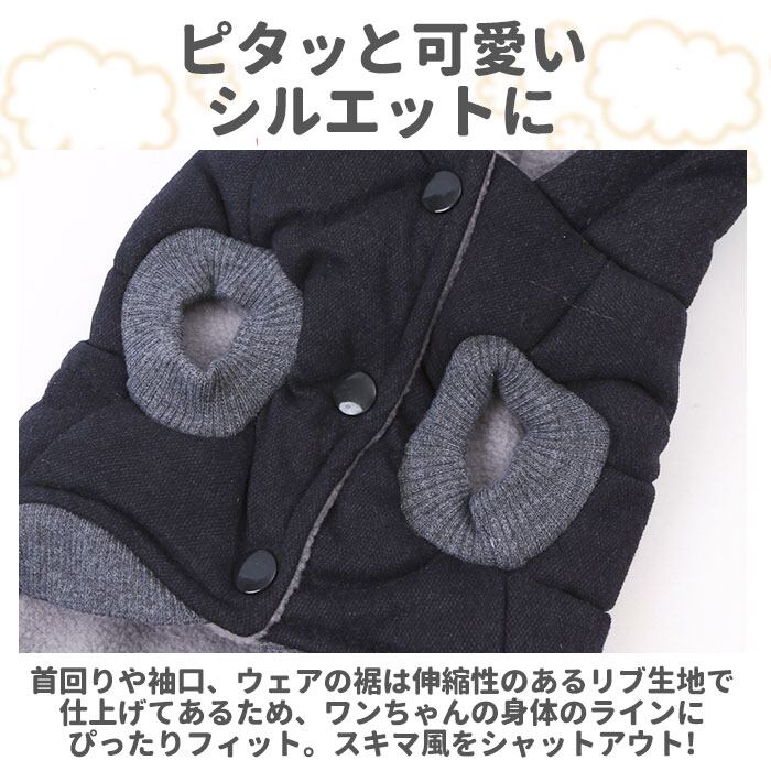 ・首回りや袖口、ウェアの裾は伸縮性のあるリブ生地で仕上げてあるため、ワンちゃんの身体のラインにぴったりフィット。スキマ風をシャットアウトして、木枯らしが吹く日も元気にお散歩。