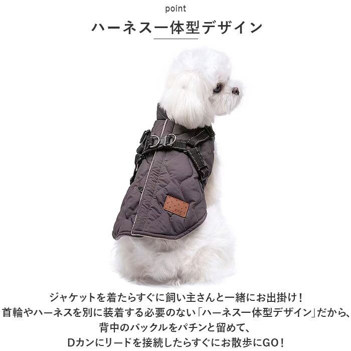・ジャケットを着たらすぐに飼い主さんと一緒にお出掛け!首輪やハーネスを別に装着する必要のない「ハーネス一体型デザイン」だから、背中のバックルをパチンと留めて、Dカンにリードを接続したらすぐにお散歩にGO!