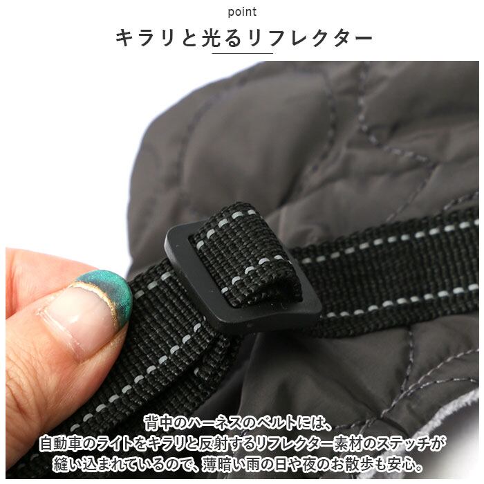 ・背中のハーネスのベルトには、自動車のライトをキラリと反射するリフレクター素材のステッチが縫い込まれているので、薄暗い雨の日や夜のお散歩も安心。