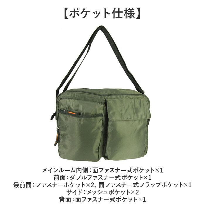 ・最前面:ファスナーポケット×2、面ファスナー式フラップポケット×1