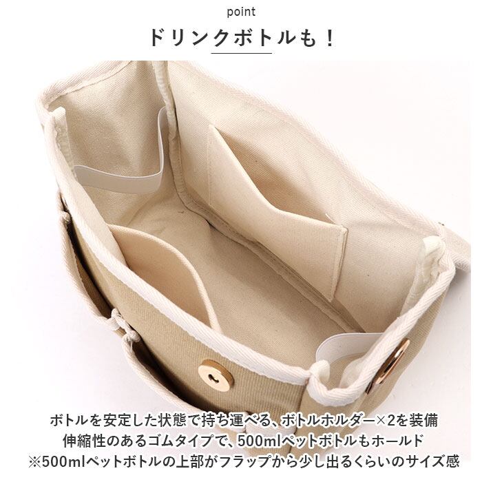 ・ボトルを安定した状態で持ち運べる、ボトルホルダー×2を装備。伸縮性のあるゴムタイプで、500mlペットボトルもホールド。(※500mlペットボトルの上部がフラップから少し出るくらいのサイズ感です。)