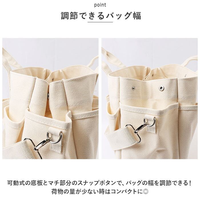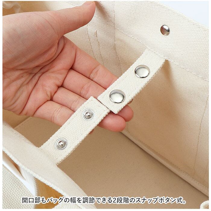 ・可動式の底板とマチ部分のスナップボタンで、バッグの幅を調節できる!荷物の量が少ない時はコンパクトに◎開口部も2段階のスナップボタン式。