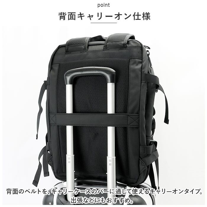 ・背面のベルトを、キャリーケースのバーに通して使えるキャリーオンタイプ。出張などにもおすすめ。
