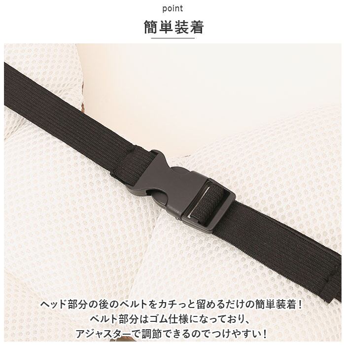 ・ヘッド部分の後のベルトをカチっと留めるだけの簡単装着!ベルト部分はゴム仕様になっており、アジャスターで調節できるのでつけやすい!