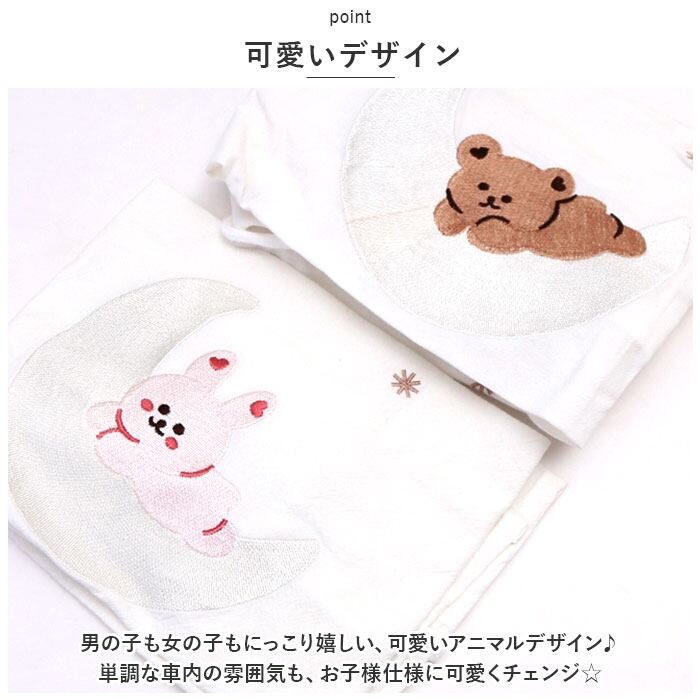 ・男の子も女の子もにっこり嬉しい、可愛いアニマルデザイン♪単調な車内の雰囲気も、お子様仕様に可愛くチェンジ☆お気に入りがきっと見つかる。