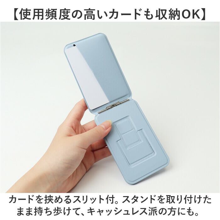 ・カードを挟めるスリット付。スタンドを取り付けたまま持ち歩けて、キャッシュレス派の方にも。