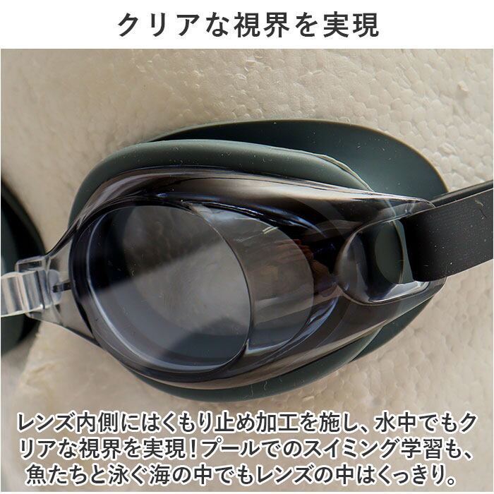 ・レンズ内側にはくもり止め加工を施し、水中でもクリアな視界を実現!プールでのスイミング学習も、魚たちと泳ぐ海の中でもレンズの中はくっきり。
