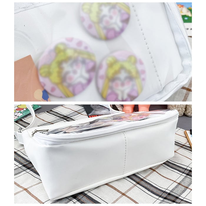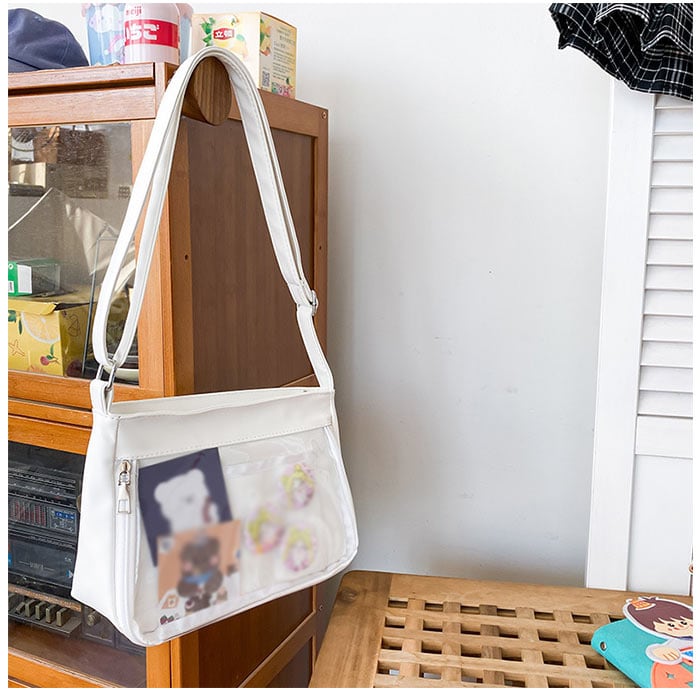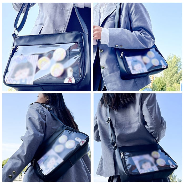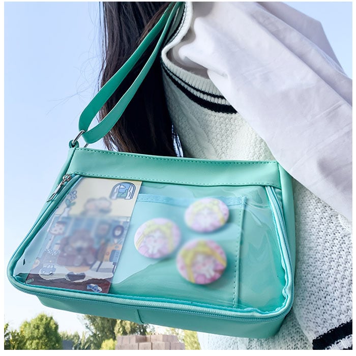 ・ファスナーがコの字型に大きく開く、前面のクリアウィンドウがこの痛バッグのヒ・ミ・ツ。「推し」の缶バッジや写真を入れて「推し色」にカスタマイズ自在。