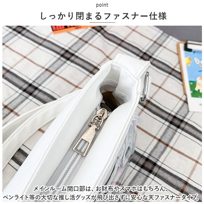 ・メインルーム開口部は、お財布やスマホはもちろん、ペンライト等の大切な推し活グッズが飛び出さずに安心な天ファスナータイプ。