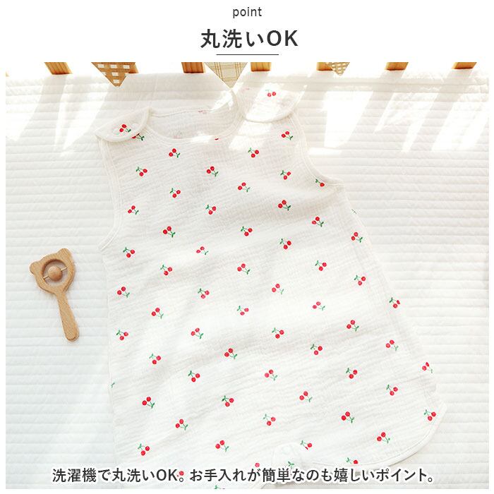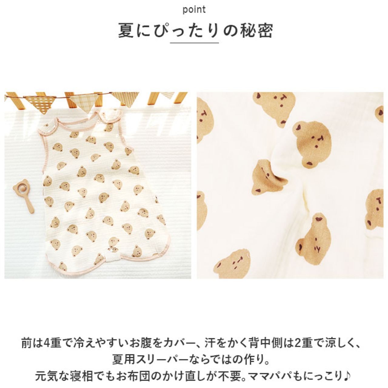 ・前は4重で冷えやすいお腹をカバー、汗をかく背中側は2重で涼しく、夏用スリーパーならではの作り。元気な寝相でもお布団のかけ直しが不要。ママパパもにっこり♪