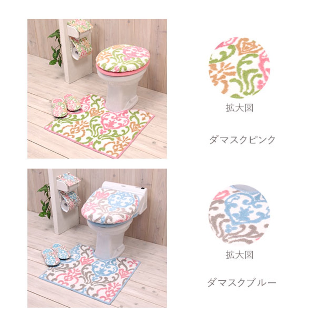 フタカバー:パイル糸(アクリル100%)、マット,スリッパ:パイル糸(アクリル100%)