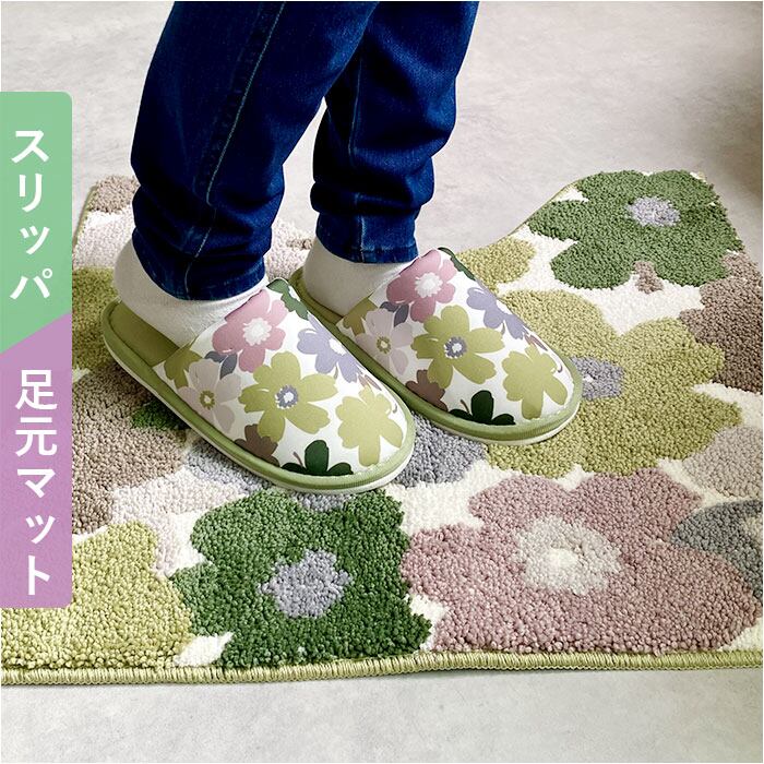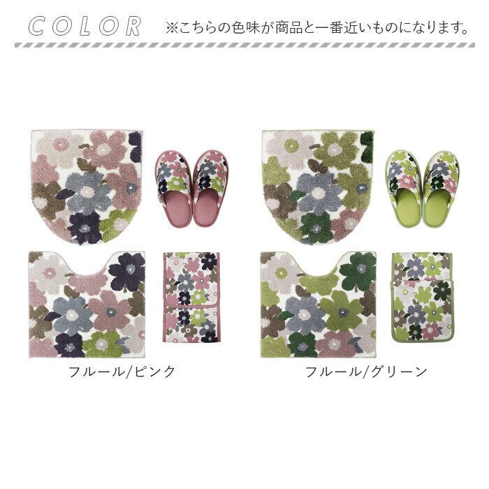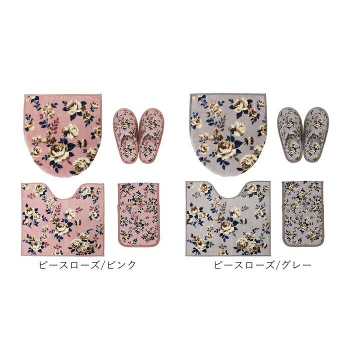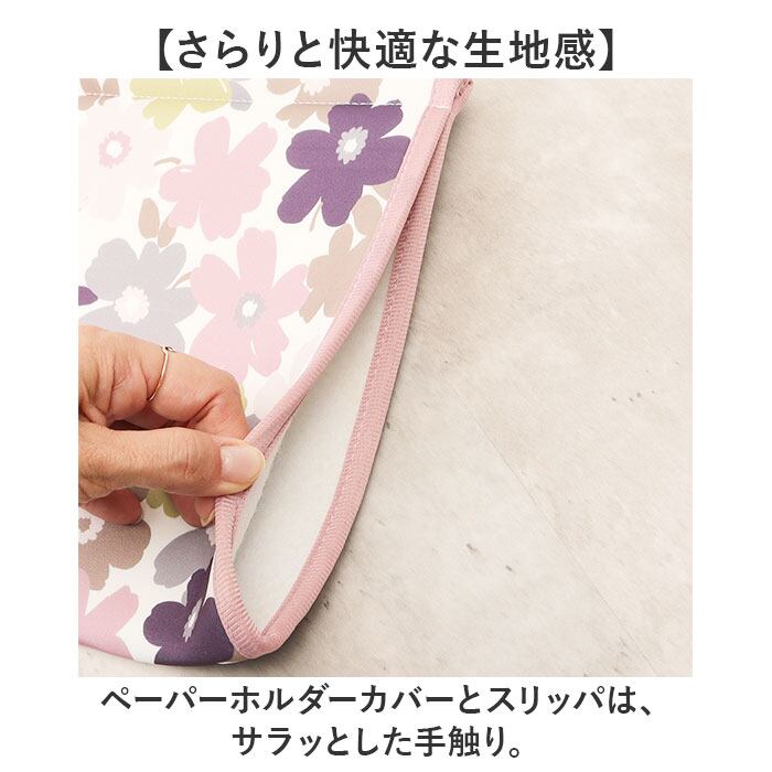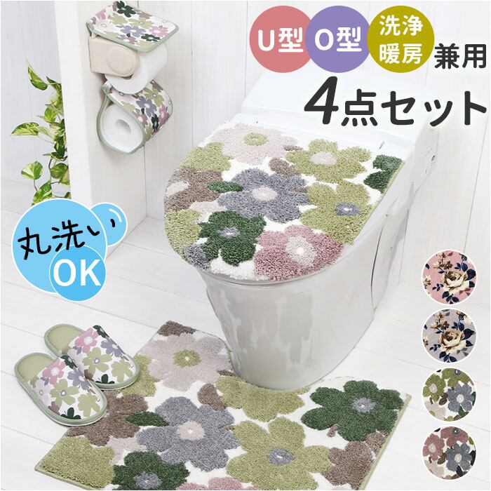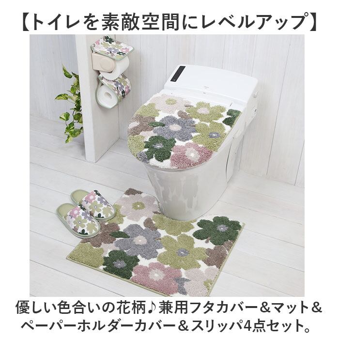 ・優しい色合いの花柄♪兼用フタカバー&マット&ペーパーホルダーカバー&スリッパ4点セット。