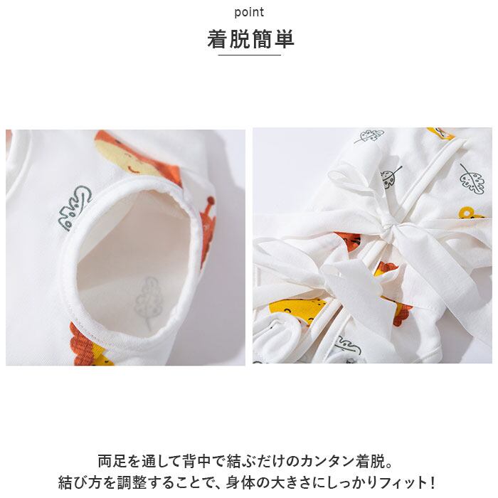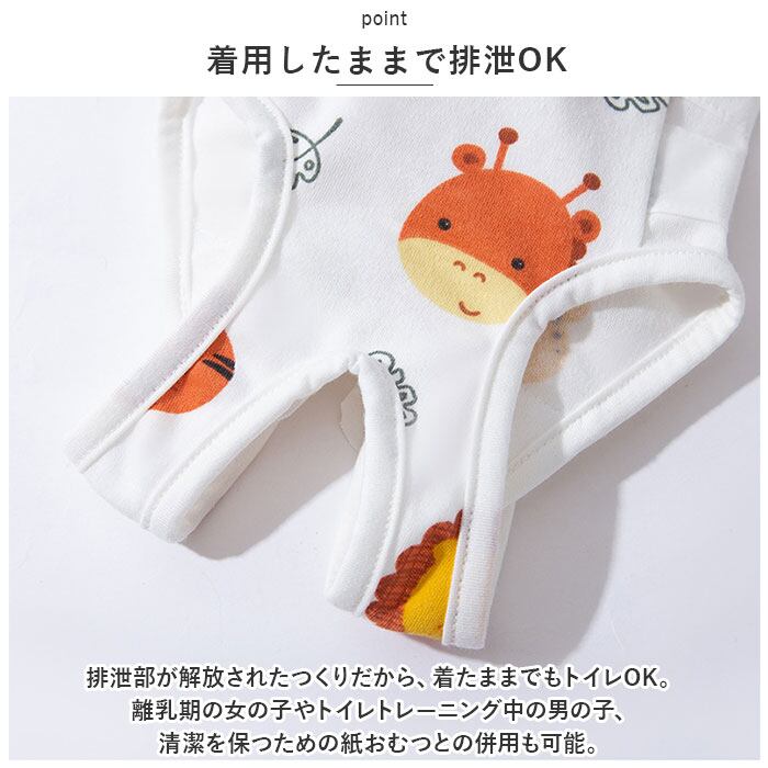 ・排泄部が解放されたつくりだから、着たままでもトイレOK。離乳期の女の子やトイレトレーニング中の男の子、清潔を保つための紙おむつとの併用も可能。