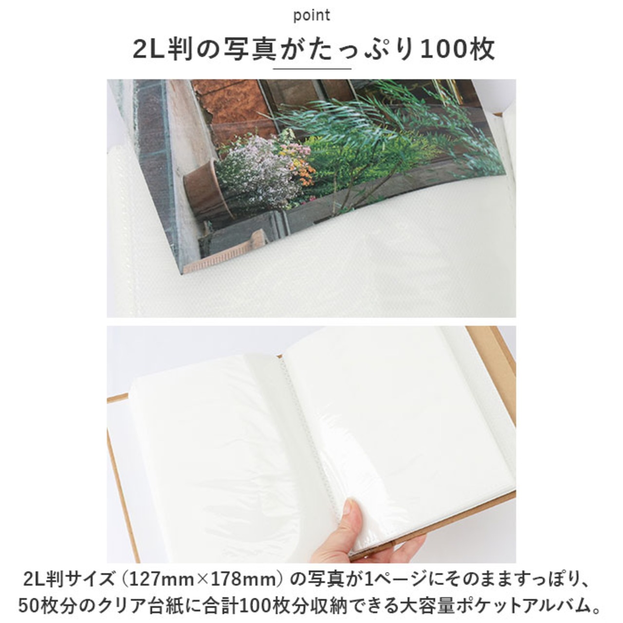 2L判サイズ(127mm×178mm)の写真が1ページにそのまますっぽり、50枚分のクリア台紙に合計100枚分収納できる大容量ポケットアルバム。