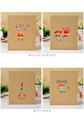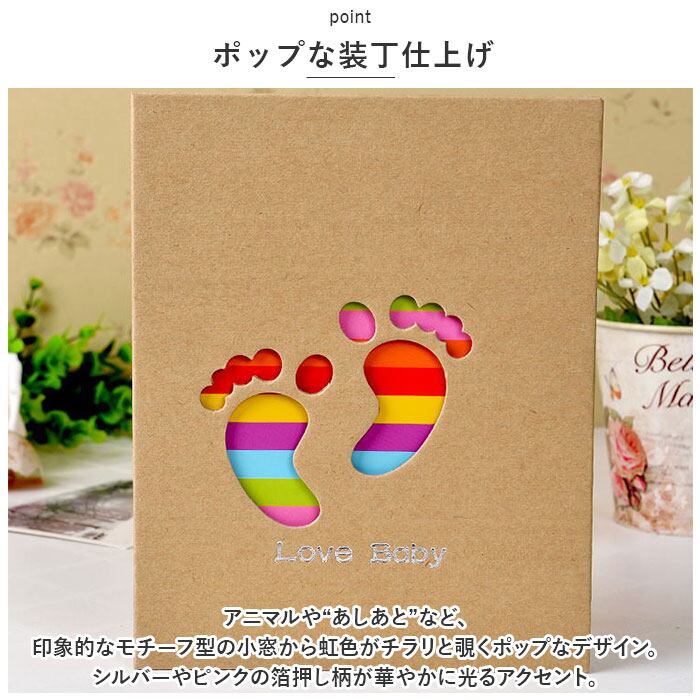 ・アニマルや“あしあと”など、印象的なモチーフ型の小窓から虹色がチラリと覗くポップなデザイン。シルバーやピンクの箔押し柄が華やかに光るアクセント。