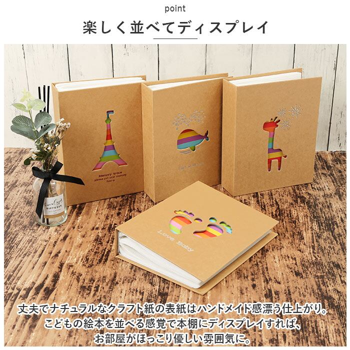 ・丈夫でナチュラルなクラフト紙の表紙はハンドメイド感漂う仕上がり。こどもの絵本を並べる感覚で本棚にディスプレイすれば、お部屋がほっこり優しい雰囲気に。