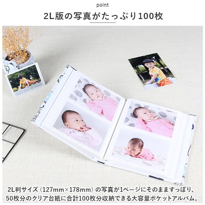 2L判サイズ(127mm×178mm)の写真が1ページにそのまますっぽり、50枚分のクリア台紙に合計100枚分収納できる大容量ポケットアルバム。