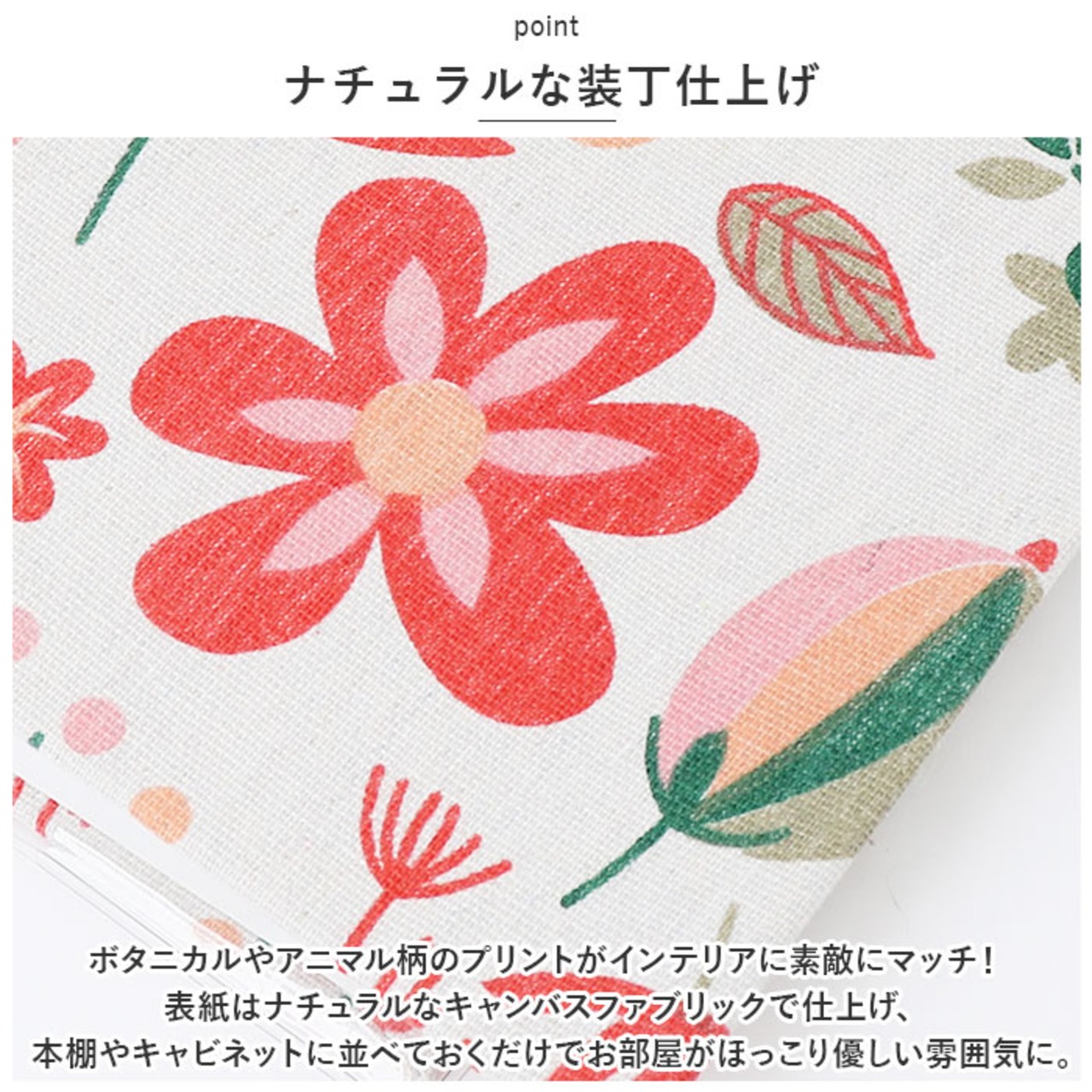 ・ボタニカルやアニマル柄のプリントがインテリアに素敵にマッチ!表紙はナチュラルなキャンバスファブリックで仕上げ、本棚やキャビネットに並べておくだけでお部屋がほっこり優しい雰囲気に。