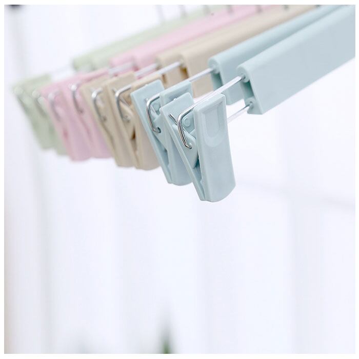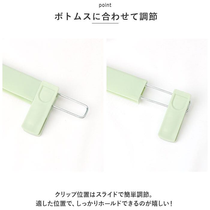 ・左右のクリップを使って、パンツやスカートを挟むだけ。型崩れや滑り落ちを防いで、スマートに干せるアイテム。