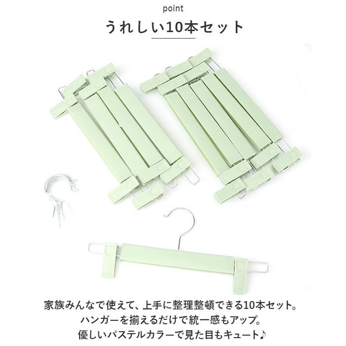 ・家族みんなで使えて、上手に整理整頓できる10本セット。ハンガーを揃えるだけで統一感もアップ。優しいパステルカラーで見た目もキュート♪