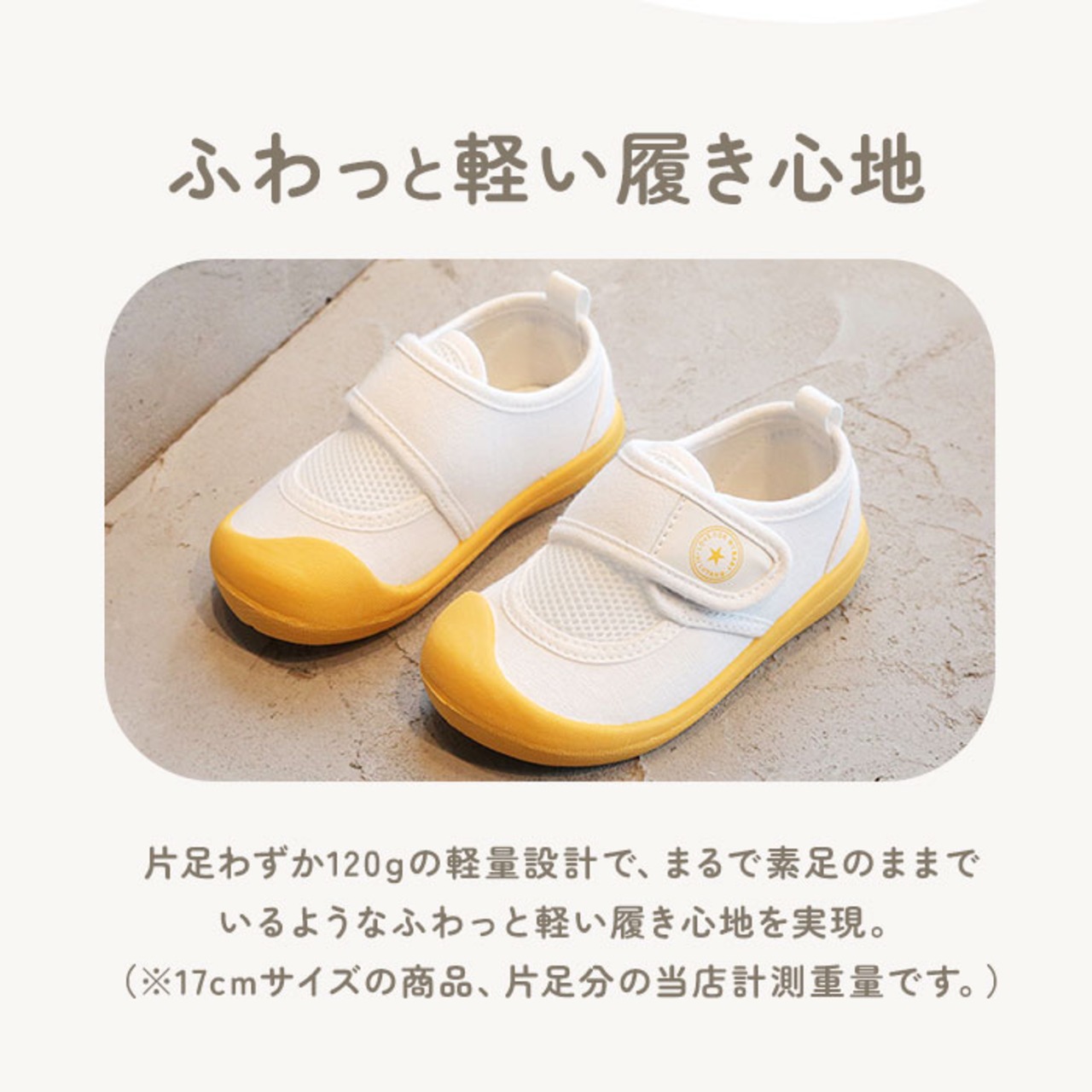 ・片足わずか120gの軽量設計で、まるで素足のままでいるようなふわっと軽い履き心地を実現。(※17cmサイズの商品、片足分の当店計測重量です。)