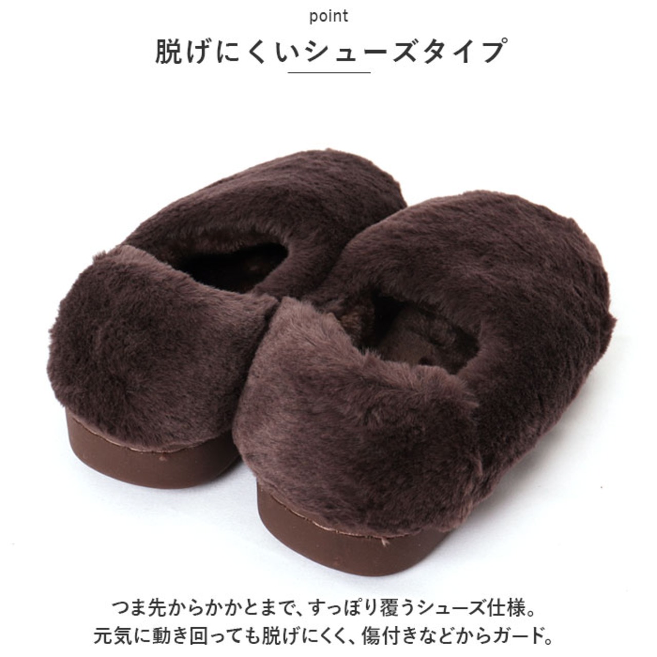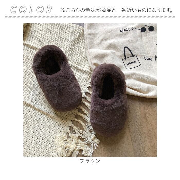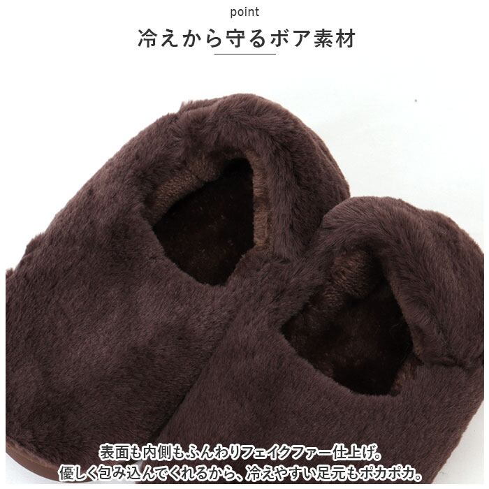 ・表面も内側もふんわりフェイクファー仕上げ。優しく包み込んでくれるから、冷えやすい足元もポカポカ。