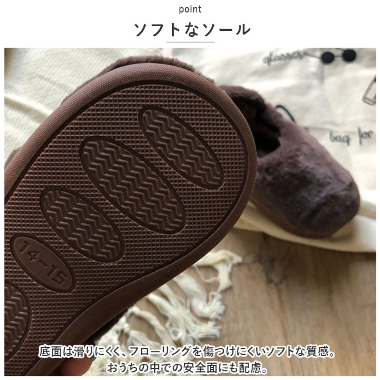 ・底面は滑りにくく、フローリングを傷つけにくいソフトな質感。おうちの中での安全面にも配慮。