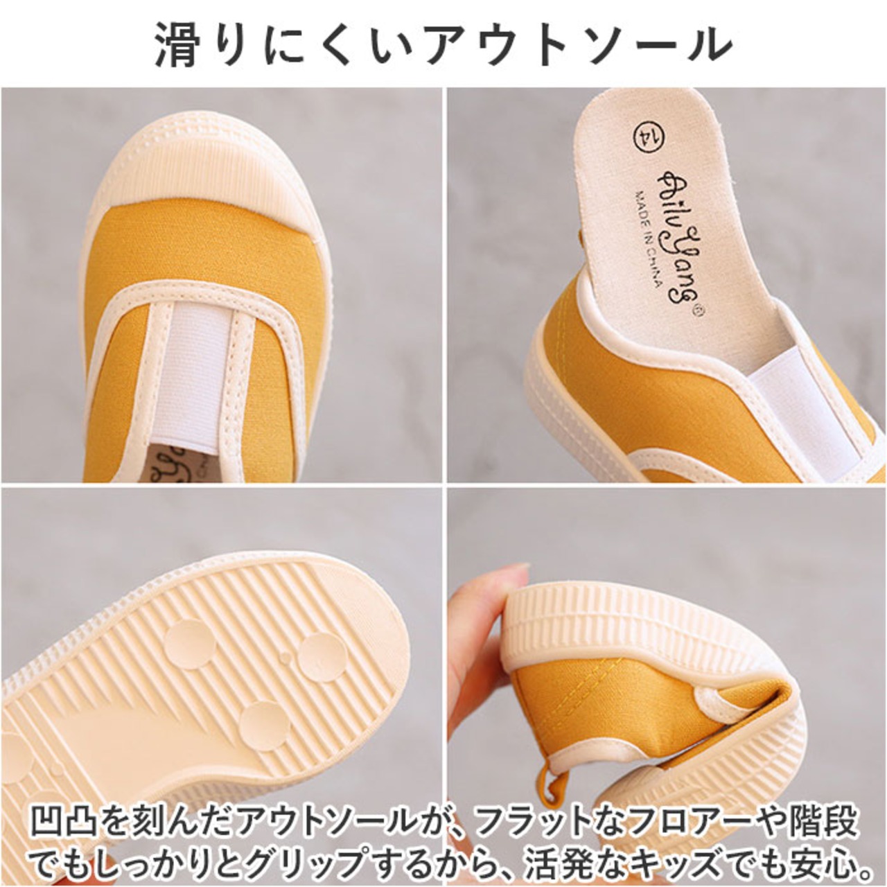 ・凹凸を刻んだアウトソールが、フラットなフロアーや階段でもしっかりとグリップするから、活発なキッズでも安心。